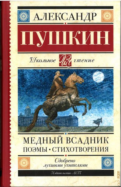 Александр Сергеевич Пушкин (1799—1837) — русский поэт,драматург и прозаик. Еще при жизни современники называли его величайшим национальным поэтом. Поэма "Медный всадник" (1833) рассказывает историю бедного чиновника Евгения, живущего в Санкт-Петербурге, который в результате наводнения теряет любимую. Сошедший с ума от горя Евгений начинает бродяжничать по столице и в порыве эмоций обвиняет во всех своих бедах Медного всадника — памятник Петру I на Неве. При жизни Александра Пушкина "Медный всадник" вышел небольшим отрывком, так как император Николай I требовал внести большие корректировки, на которые Пушкин не был согласен. Первая публикация всей стихотворной повести была уже после смерти поэта — в 1837 году. В сборник также вошли основные произведения Александра Пушкина,изучение которых входит в обязательную школьную программу, — поэмы ("Кавказский пленник" (1822), "Бахчисарайский фонтан" (1824) и др.), лирика