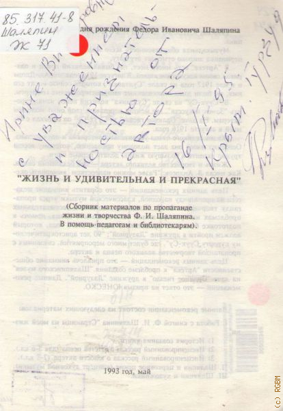 "Жизнь удивительная и прекрасная": сборник материалов по пропаганде жизни и творчества Ф. И. Шаляпина. В помощь педагогам и библиотекарям — 1993