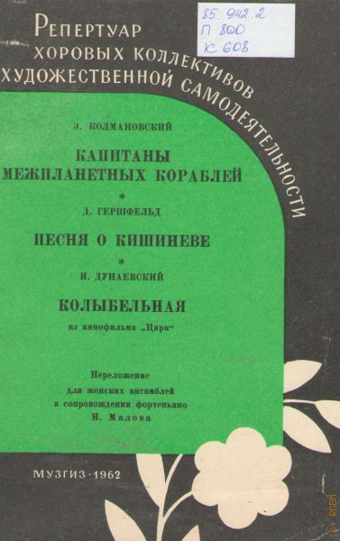 Содержание: Капитаны межпланетных кораблей: 4-х голосный женский хор или квартет, 3-х голосный женский хор или терцет / Э. Колмановский, сл. С. Гребенникова, Н. Добронравова. Песня о Кишиневе: 4-х голосный женский хор или квартет, 3-х голосный или терцет / Д. Гершфельд. сл. А. Лукьянова. Колыбельная: из кф "Цирк": 4-х голосный женский хор или квартет, 3-х голосный женский хор или терцет / И. Дунаевский, сл. В. Лебедева - Кумача