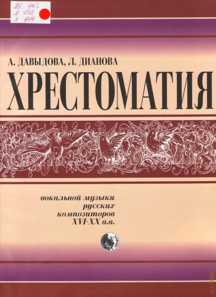 Давыдова А, Хрестоматия вокальной музыки русских композиторов 16 - 20 в.в.: для мужского и женского голоса с сопровождением. [учебное пособие по курсу "Сольное пение" для учащихся факультетов "Хоровое дирижирование" средних и высших учебных заведений]. составители: А. Давыдова, Л. Дианова — 2006