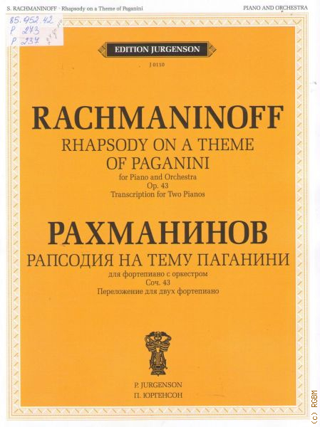 Рахманинов С., Рапсодия на тему Паганини: соч. 43: для фортепиано с оркестром. Переложение для 2-х фортепиано — Y 2012