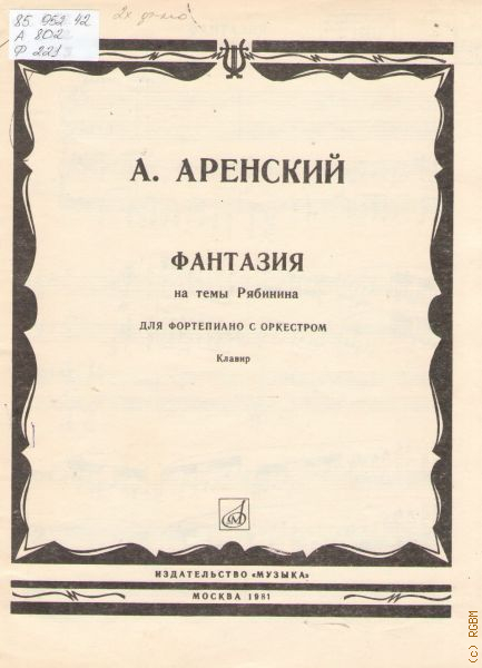 ![Аренский А. С., Фантазия на темы И. Рябинина. Соч. 48: для фортепиано с оркестром. [Переложение для 2-х фортепиано автора] — 1981](/searchcat/covers/RGUB-BIBL-0000783902-note.jpg) |