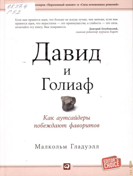 Автор мировых бестселлеров журналист The New Yorker Малкольм Гладуэлл, вдохновленный библейским противостоянием Давида и Голиафа, анализирует феномен победы слабого над сильным. В каждой из глав рассказывается история одного человека — знаменитого или неизвестного, заурядного или талантливого, — который, столкнувшись с, казалось бы, неразрешимыми проблемами, был вынужден действовать. Как быть: играть по правилам или довериться своим инстинктам? Сдаться или держаться до последнего? Нанести ответный удар или простить? Человек — существо адаптивное, но бывают такие ситуации, когда адаптация тождественна поражению. Поэтому стоит мобилизовать свои внутренние резервы: волю, ум, физические ресурсы, фантазию — и одержать верх над неблагоприятными обстоятельствами. Истории реальных людей, выстоявших в битве с могучими «голиафами» невероятных трудностей, показывают нам, что даже слабому может быть под силу вынести страшные удары судьбы и не только не сломаться, но и найти в себе силы для новых свершений