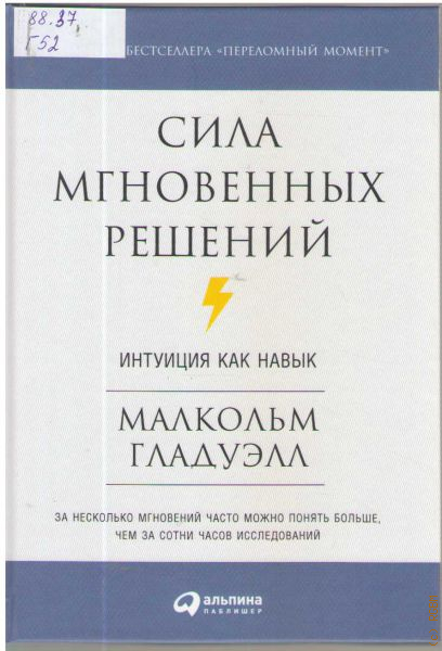 В этой книге Малкольм Гладуэлл анализирует процесс принятия решений. На богатом материале из области искусств, науки, дизайна, медицины, политики и бизнеса он раскрывает закономерности бессознательных решений и анализирует факторы, искажающие этот процесс. Автор утверждает, что все решения мы принимаем с первого взгляда — за две секунды. «Сила мгновенных решений» - книга именно об этих первых двух секундах. Книга будет интересна психологам, политологам, маркетологам — всем специалистам, успешность деятельности которых зависит от умения принимать важные решения, а также широкому кругу читателей, интересующихся последними достижениями психологии.